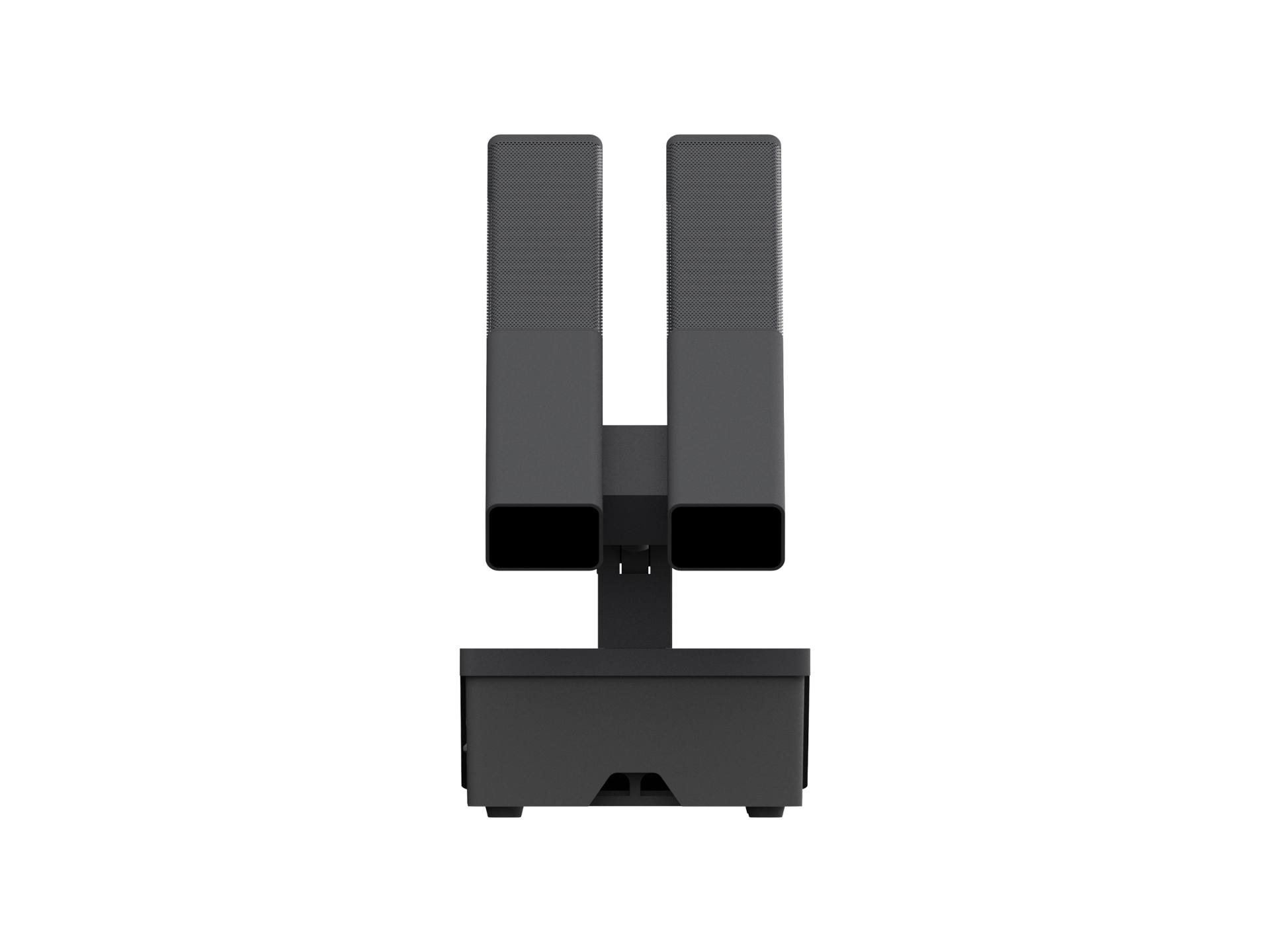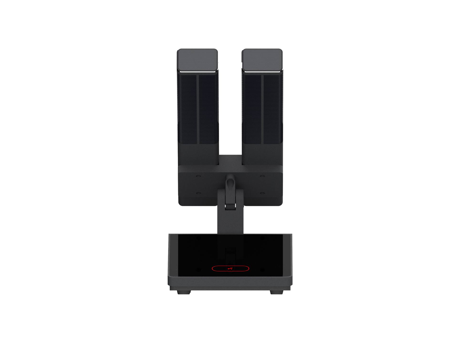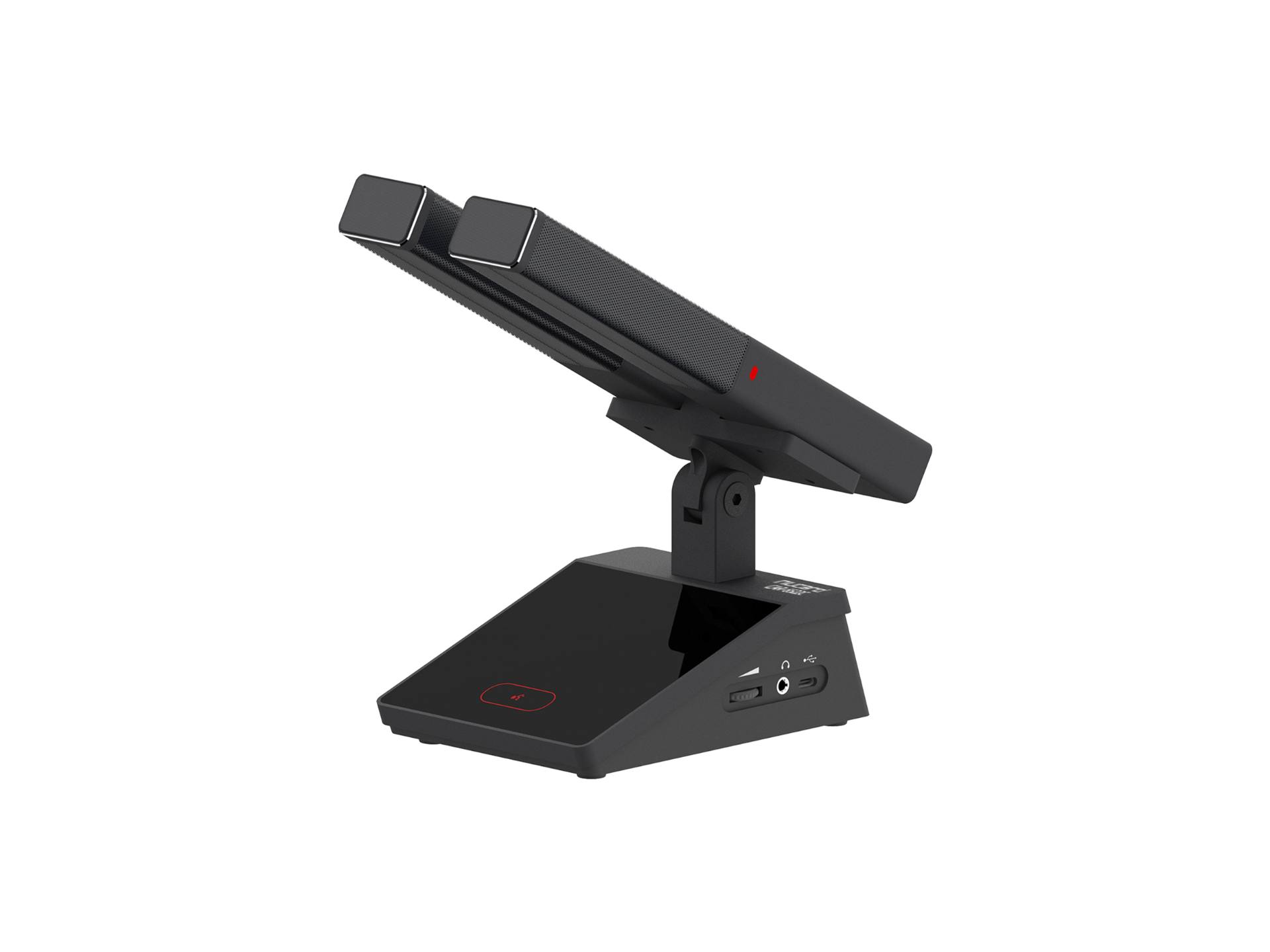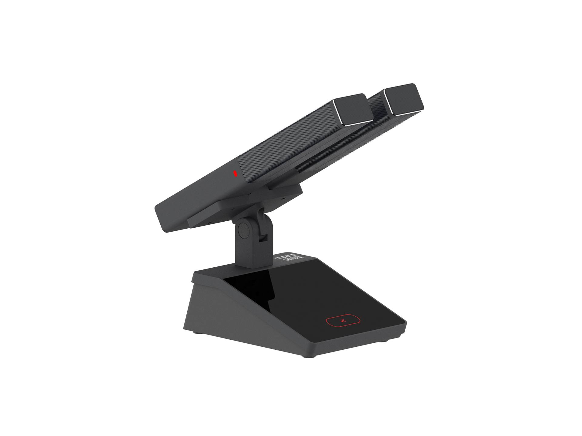 本系统设计为柱形双咪杆结够,提高拾音灵敏度和拾音范围。表面采用防掉色的氧化处理技术,话筒咪芯采用软橡胶避震,过滤由桌面震动带来的杂音。咪杆采用磁吸方式与底座连接,及稳定又方便拆卸。